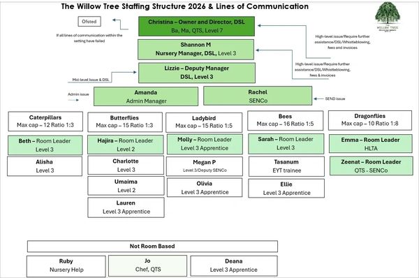 We are a training nursery, promoting life long learning. Most of our staff at The Willow Tree Nursery are highly trained and experienced in child care. Others are learning on the job; learning the required skills alongside their coaches for a real hands on experience.